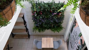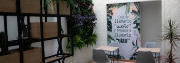Los diseños verdes son un elemento esencial de nuestra propuesta de valor. Tenemos una gran presencia de plantas, un jardín verde vertical y un hermoso arreglo escultural de plantas anclado al techo.